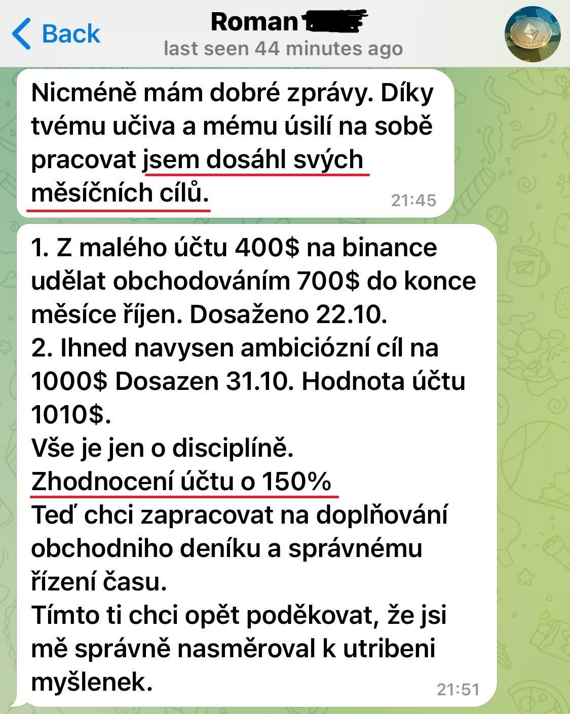 Pojďte se podívat jak vypadá reálný trading. Dívejte se mi pod ruce a do mé hlavy při mém obchodování. Sdílím každý můj vstup i výstup živě se všemi členy trading roomu.