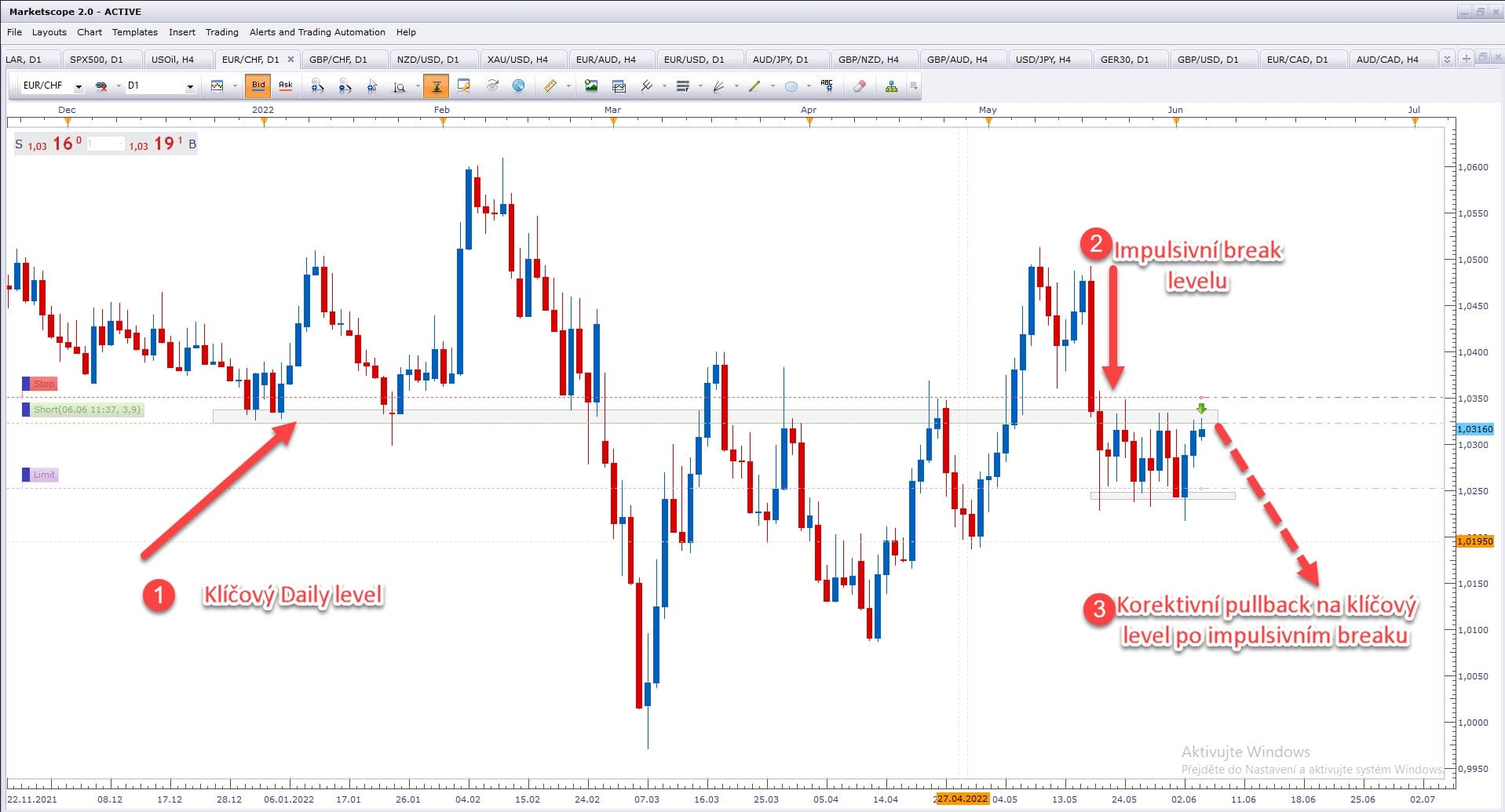 Následně si všimněte korektivního pullbacku zpátky k levelu (aktuálně jsme short právě od této lokace), využili jsme setupu Impulsivní break-Korektivní retest ke klíčovému levelu.