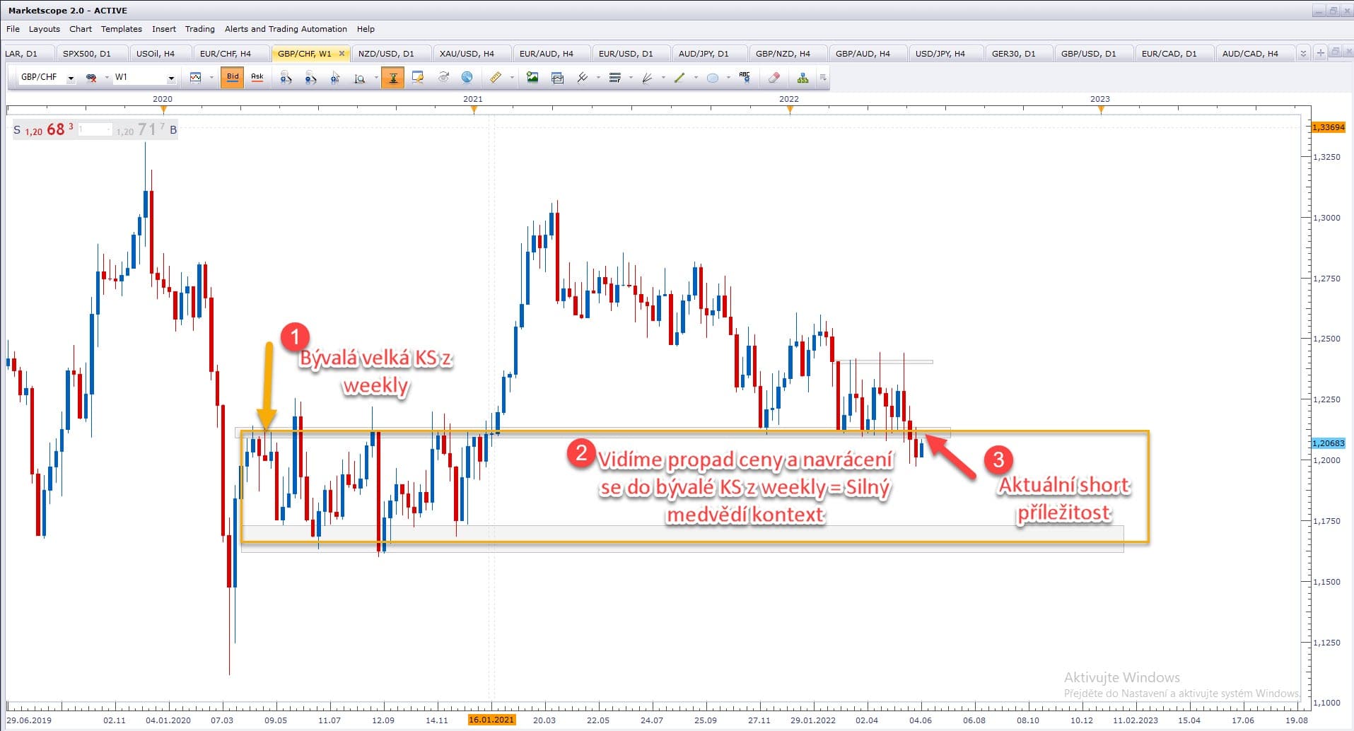 GBPCHF je aktuálně velmi zajímavým kandidátem pro short - Důvodem je obzvláště silná konfluence signálů jak z weekly, tak z Daily. Pojďme se podívat nejdříve na Weekly graf, kde jsme dostali silný short signál: