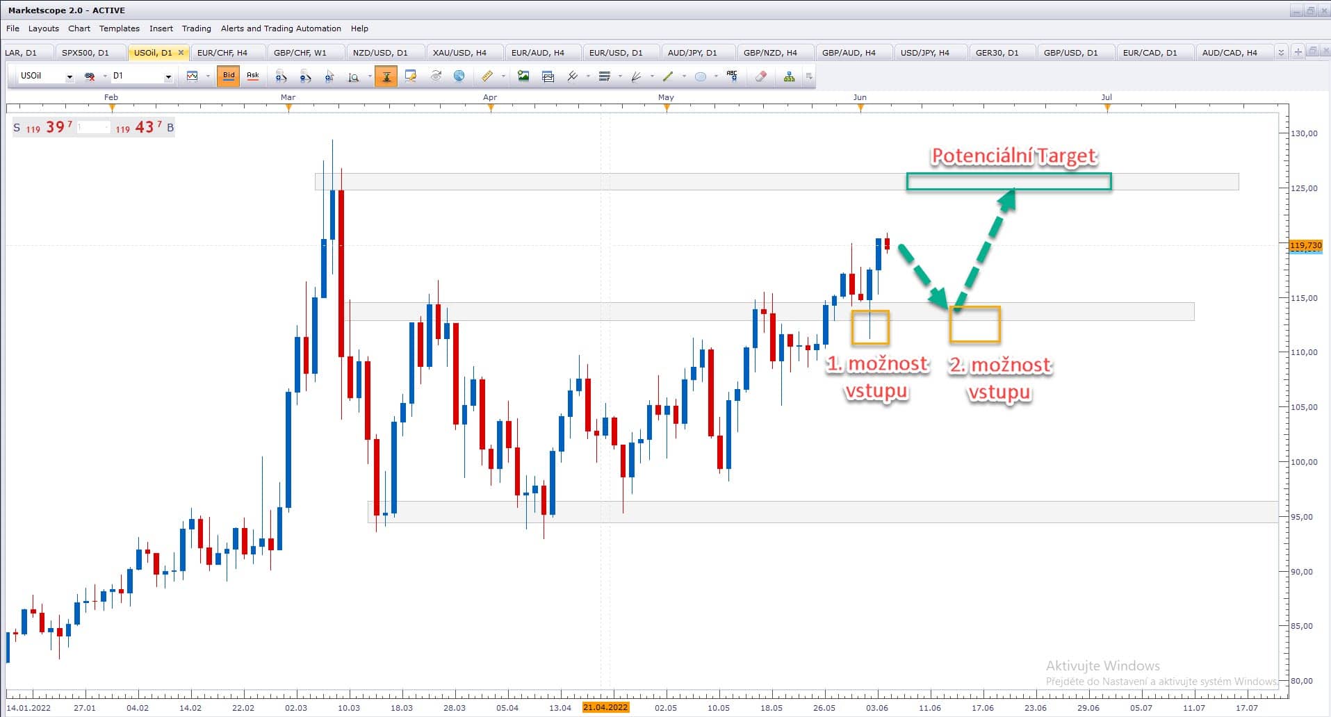 Možnost vstupu č.1 jsme minulý týden Longovali v Live roomu. Stále vnímám tento level kolem@113-144,500 jako velmi dobrou Long lokaci pro vstup na pokračování tohoto UPtrendu. Dokud tato klíčová support zóna drží, USOIL má velmi vysokou pravděpodobnost udržení uptrendu a růstu cen.