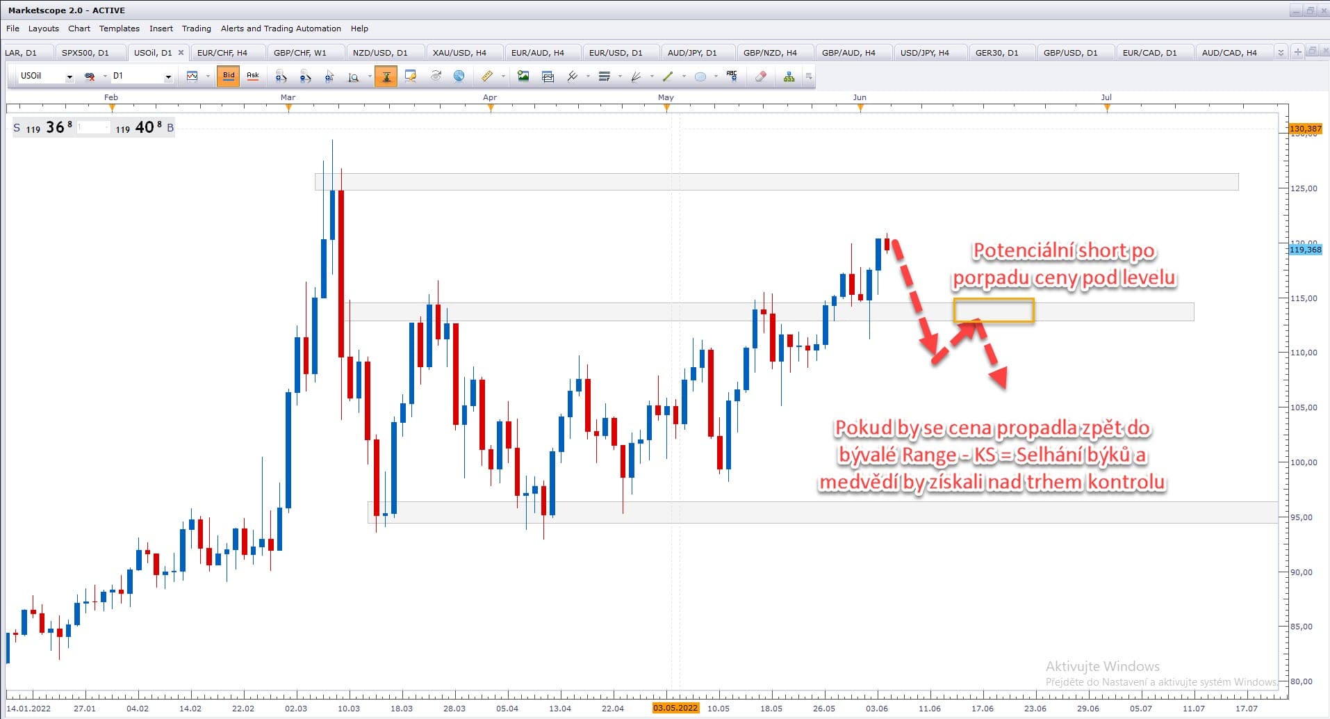 Na grafu výše vidíme druhý scénář. Long scénář je z mého pohledu mnohem pravděpodobnější, ale není špatné připravit se i na alternativní scénáře. V tomto případě se díváme na shortový scénář, kdy býci na pullbacku zpátky k supportu neudrží level a cena se tedy propadne pod support.