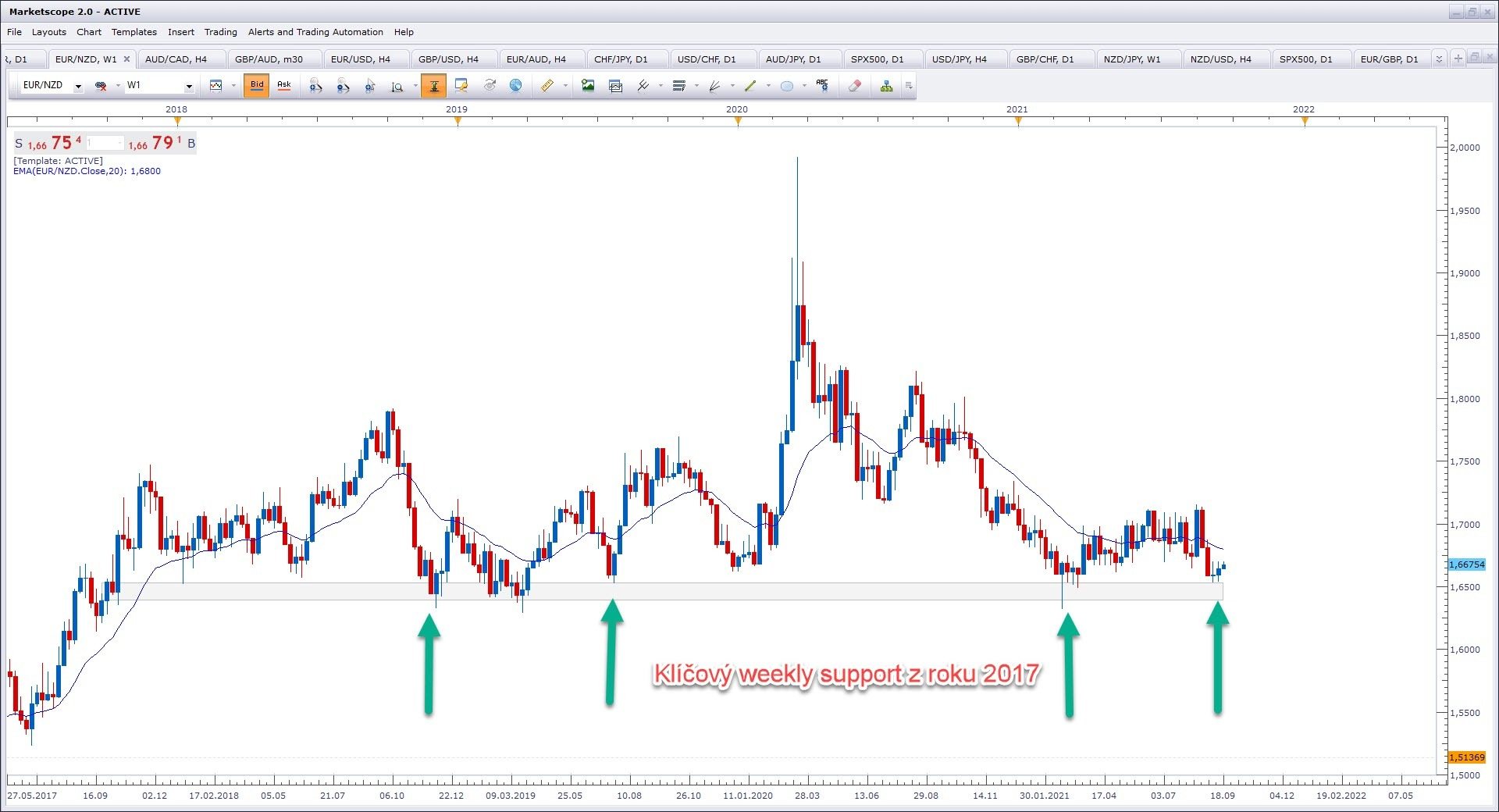 EURNZD se v dlouhodobém downtrendu dostal až na weekly klíčový support cca@1,6500-1,6600. Tento support drží už od roku 2017! Vždy, když se cena dostává na klíčové weekly levely, z nižších časových rámců hledáme obchodní příležitosti na reakci ceny na takový level = V tomto případě Long.