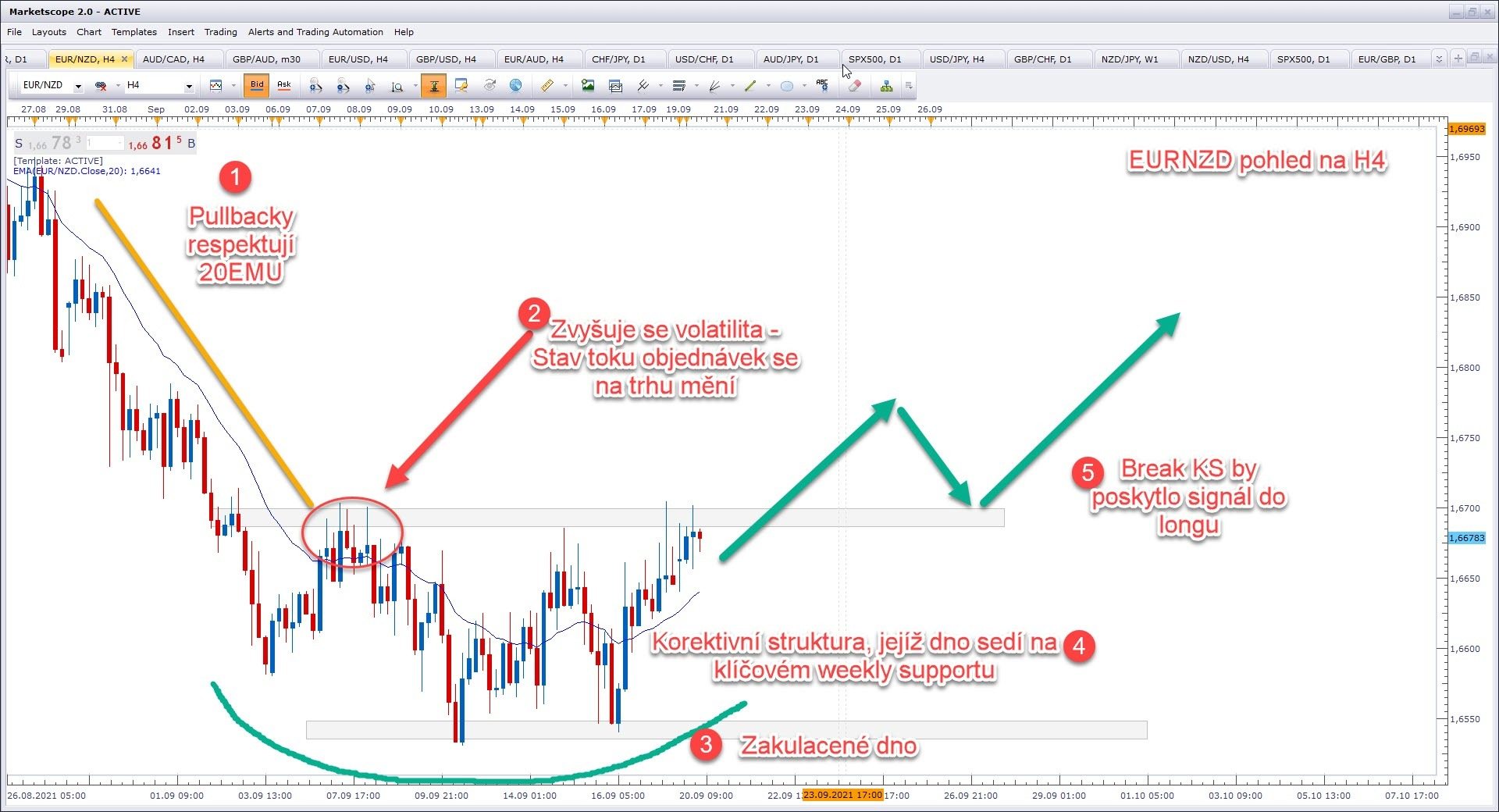 - Vytvoření pěkné Korektivní struktury (KS), jejíž dno (spodní support), shodou okolností sedí na weekly supportu
