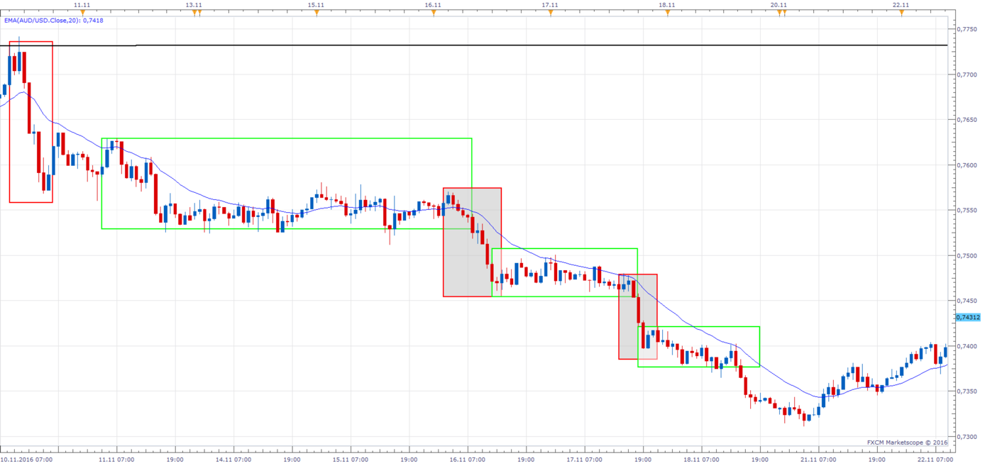 Při pohledu na graf výše vidíme boxy dvou barev: Červený box a zelený box. Když se podíváte na všechny červené boxy, všimnete si, že tyto pohyby splňují všechny charakteristiky impulsivního pohybu. Porovnejte je se zelenými boxy – Tyto pohyby mají opačné charakteristiky než ty impulsivní. Těmto pohybům říkáme korektivní pohyby a začínající tradeři by se těmto pohybům měli vyhnout obloukem.