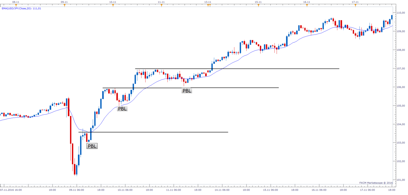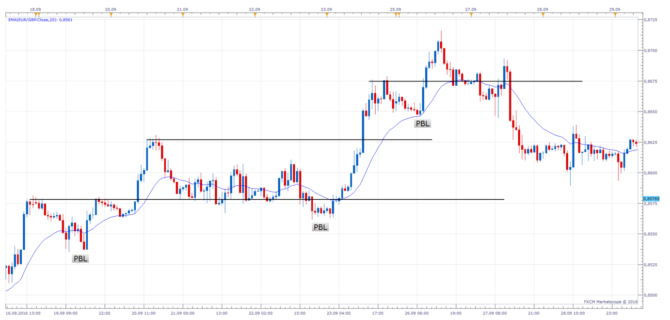 Na tomto grafu vidíme 3 výrazné trendové pullbacky a ve dvou z nich bylo PBL na dnu samotného pullbacku. Obecné pravidlo je, že býci si budou jistější při nakupování na pulbacku, pokud poslední sívce uzavře jako býčí svíce. Je to silná komunikace toho, že býci bylo schopni převzít kontrolu nad forex price action tohoto trhu za poslední svíci.