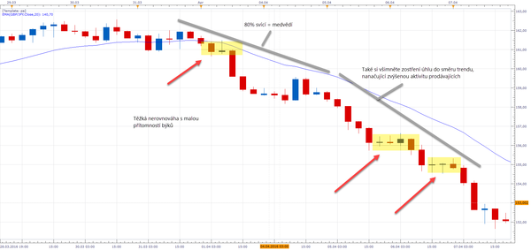 Když se podíváme na graf níže, můžeme vidět breakout z konsolidace, výprodej byl celkem impulsivní a ve výrazné nerovnováze ve prospěch medvědů. 80% svící uzavřely jako medvědí. Tato price action vykazuje velmi malé množství býků – Tak malé množství, že se za 30 4h svící zmohli na jednu agresivnější býčí svíci. Čekat na pullback setup v takovém prostředí tak zmeškáte většinu trendu zatímco cena putuje stovky pipů vašim směrem a vy neprodukujete profit.